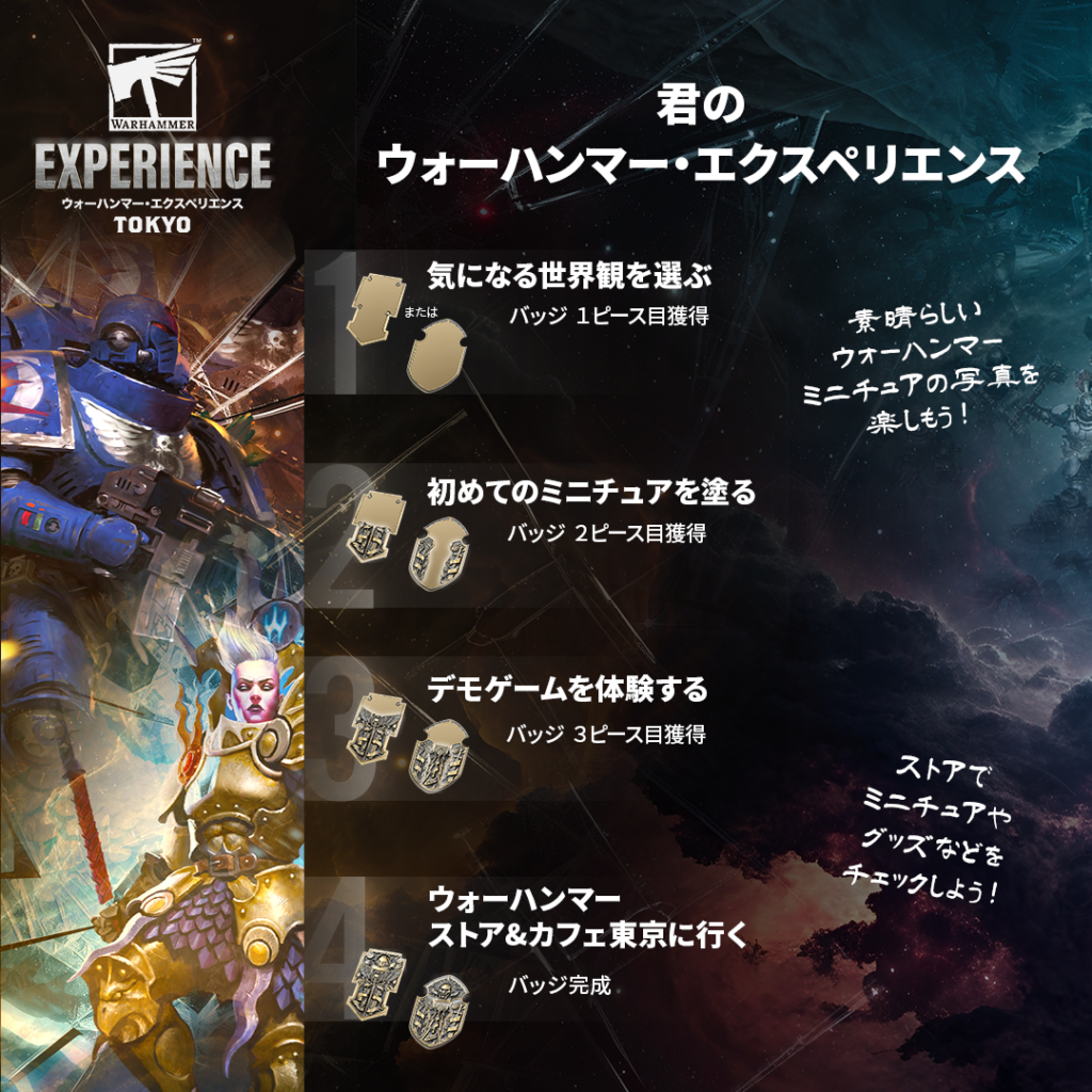 このイベントに参加する誰もがウォーハンマーホビーを体験できる! 4つの楽しいアクティビティをすべて制覇すると、かっこいいコレクタブル・ピンバッジを獲得できるぞ。